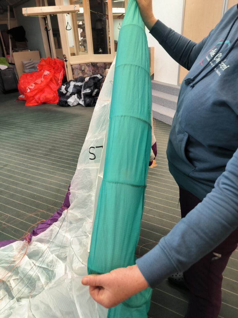 Die Kontrolle der Eintrittskante wird, wie im Bild gezeigt, durch Spannen der Kante und durch stückweise in Ansichtnahme durchgeführt. Es passiert oft, dass der Schirm auf die Nase fällt. Anschließendes Schleifen auf dem Boden führt zu Beschädigungen an der Eintrittskante.
