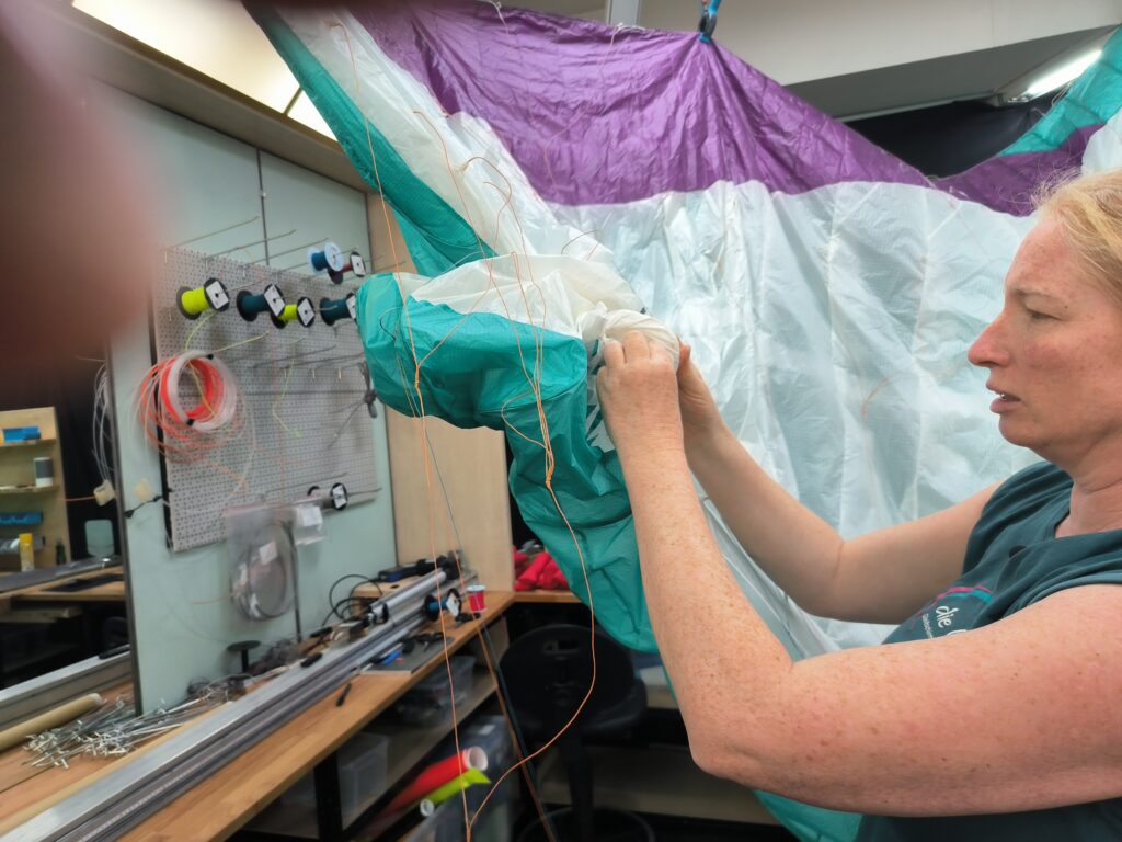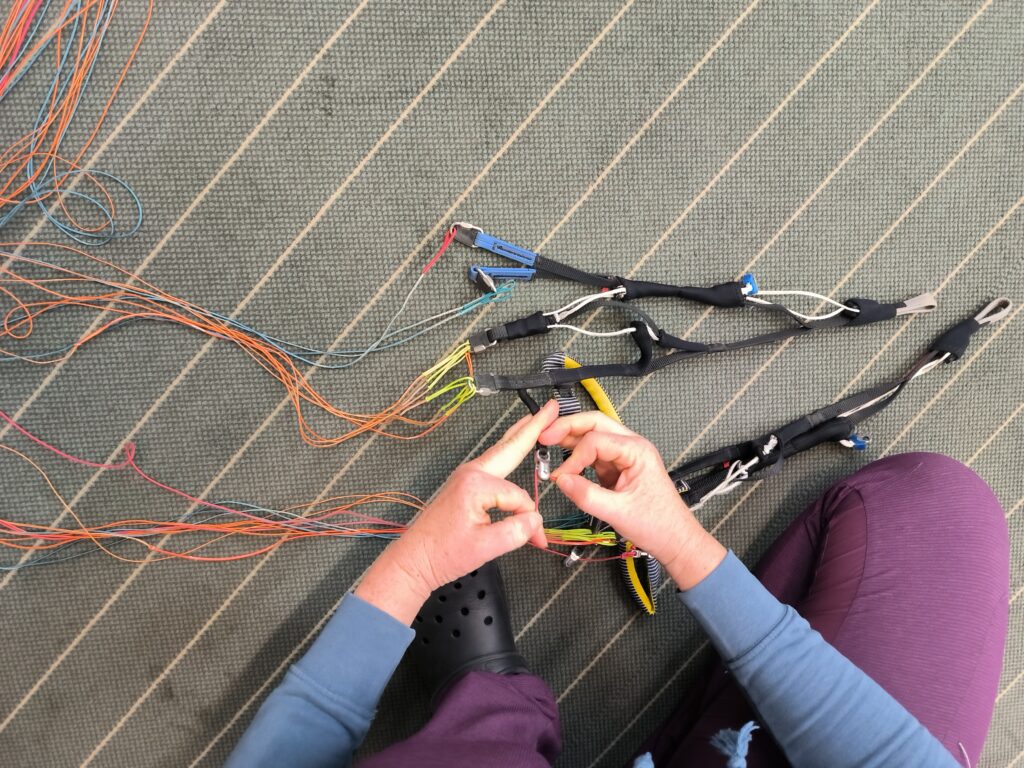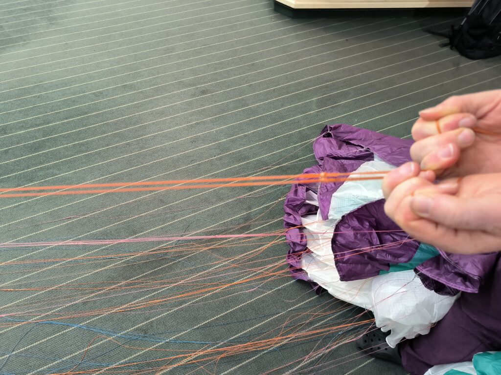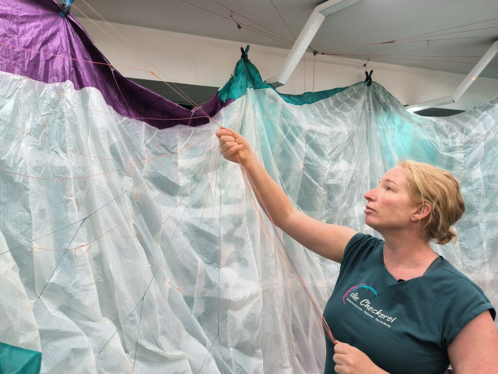 Optische und haptische Kontrolle der Fangleinen, ob eine defekt oder aufgeraut ist. Michi fand eine beschädigte A-Leine, die sie austauschte. Mit dieser Leine wurde anschließend ein Leinenlasttest durchgeführt. Details siehe weiter unten.