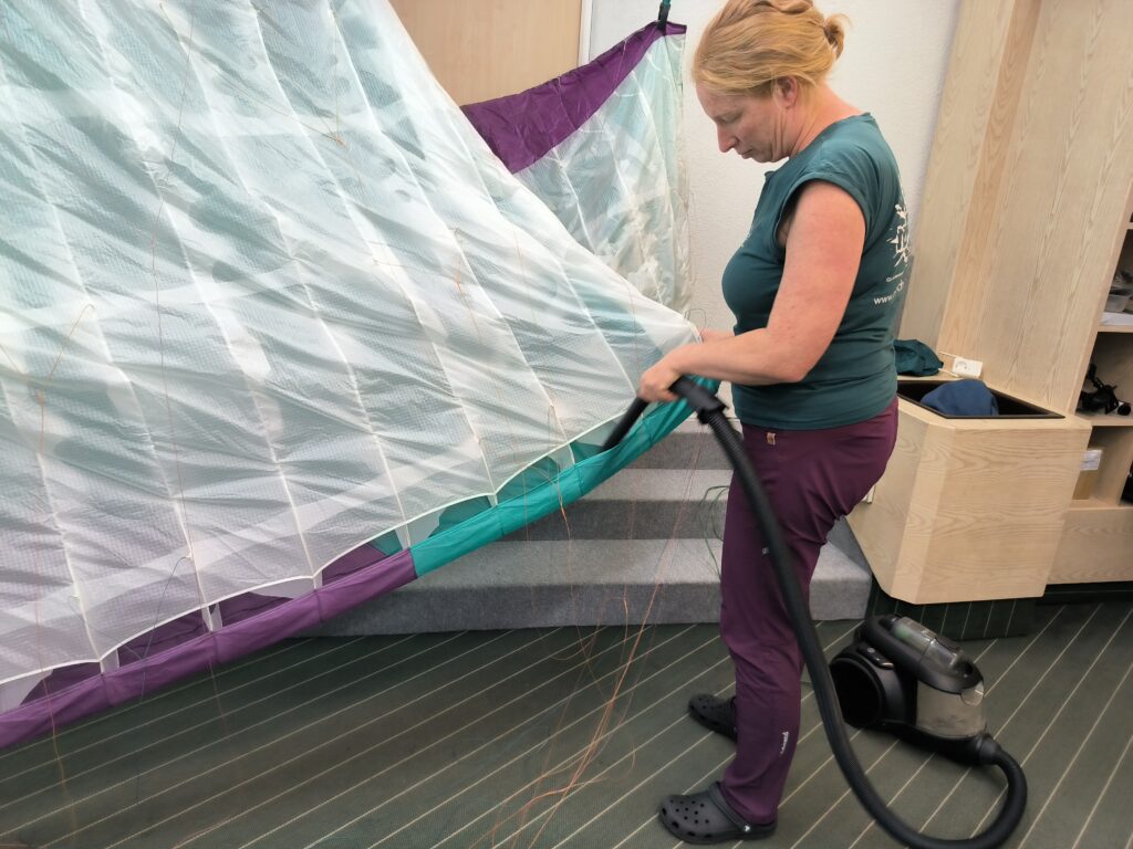 Die Öffnung der hinteren Enden, die viele Hersteller vorsehen, um den Schmutz zu entfernen, bringt in der Praxis nichts, da der Dreck sich in verschiedenen Zellen verfängt und nicht nur in der äußeren Zelle. Der Dreck lässt sich am besten entfernen, indem man den Gleitschirm kopfüber aufhängt und den vorhandenen Schmutz aussaugt.