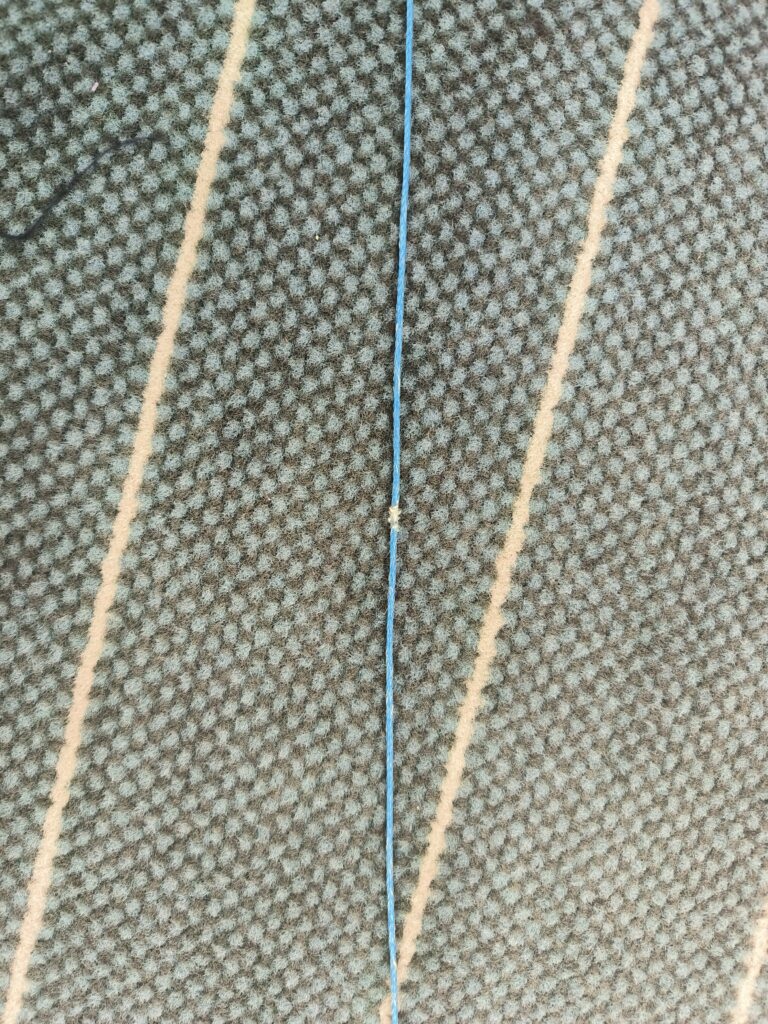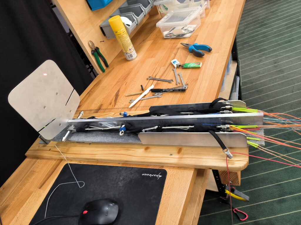 Zwar gibt sich Michi mit der Leinenvermessung schon zufrieden, jedoch sieht sie bei der Stammleine 3A2 Optimierungspotential. Grundsätzlich versucht sie, die zukünftige Längenveränderung der Leinen bei der Trimmung mit zu berücksichtigen. Die Leinen der hinteren Ebenen haben die Tendenz zu schrumpfen, da diese weniger im Flug belastet werden. Im Gegensatz zu den Leinen der A-Ebene, die wegen höherer Belastung die Tendenz haben, sich zu verlängern.