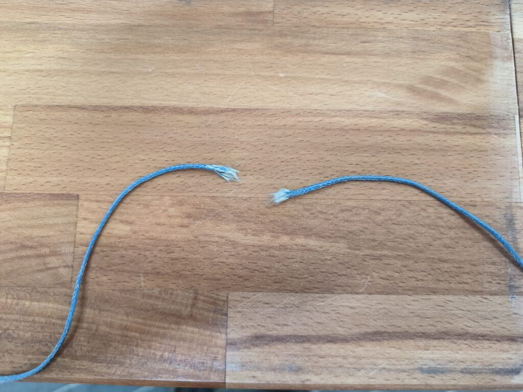 Da der Gesamtzustand des Schirms augenscheinlich einwandfrei ist, würde Michi auf einen Leinenlasttest verzichten. Bei der optischen Kontrolle hat sie jedoch einen Schaden an einer A-Leine festgestellt und diesen nutzt sie, um den Leinenlasttest durchzuführen. Tatsächlich reißt die Leine an der zuvor festgestellten Stelle bei 108 kg.