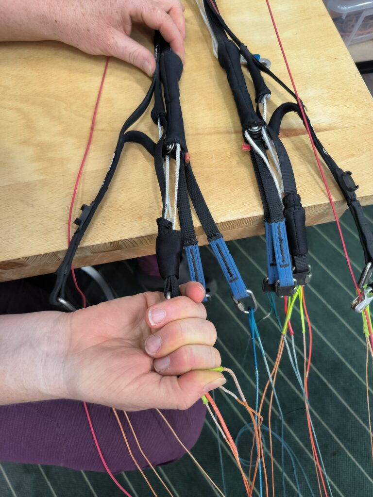Michi führt einen einfachen Symmetriecheck durch, indem sie die Bremsgriffe in die Halterung einführt und gleichmäßig gerade zieht. Die Knoten der Bremsleinen sollten bei Symmetrie nebeneinander sein (siehe zweites Foto oben). Der Symmetriecheck funktioniert auch mit allen anderen Fangleinen der gleichen Ebene und Leinennummer.