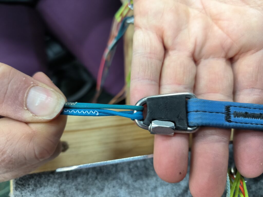 Da die Leine 3A2 rechte Seite ungefähr 1 cm zu lang ist und da wegen der höheren Last der A-Ebene eine weitere Längung zu erwarten ist, wird diese mit einem Doppelloop am Leinenschloss um 1 cm gekürzt (siehe Foto oben rechts).