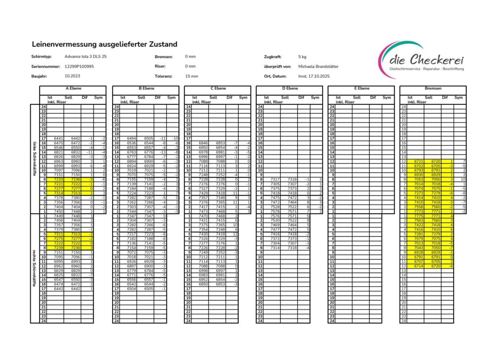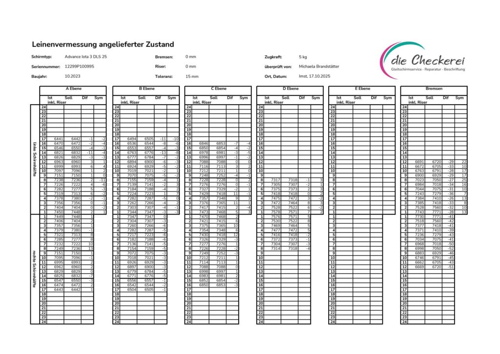 Hier unterscheidet sich die Leinenvermessung von Michi von vielen anderen Checkbetrieben, die nur ein Protokoll nach der Trimmung mitliefern. Durch das Protokoll vor und nach der Messung ist ein Vergleich der Trimmung möglich.
