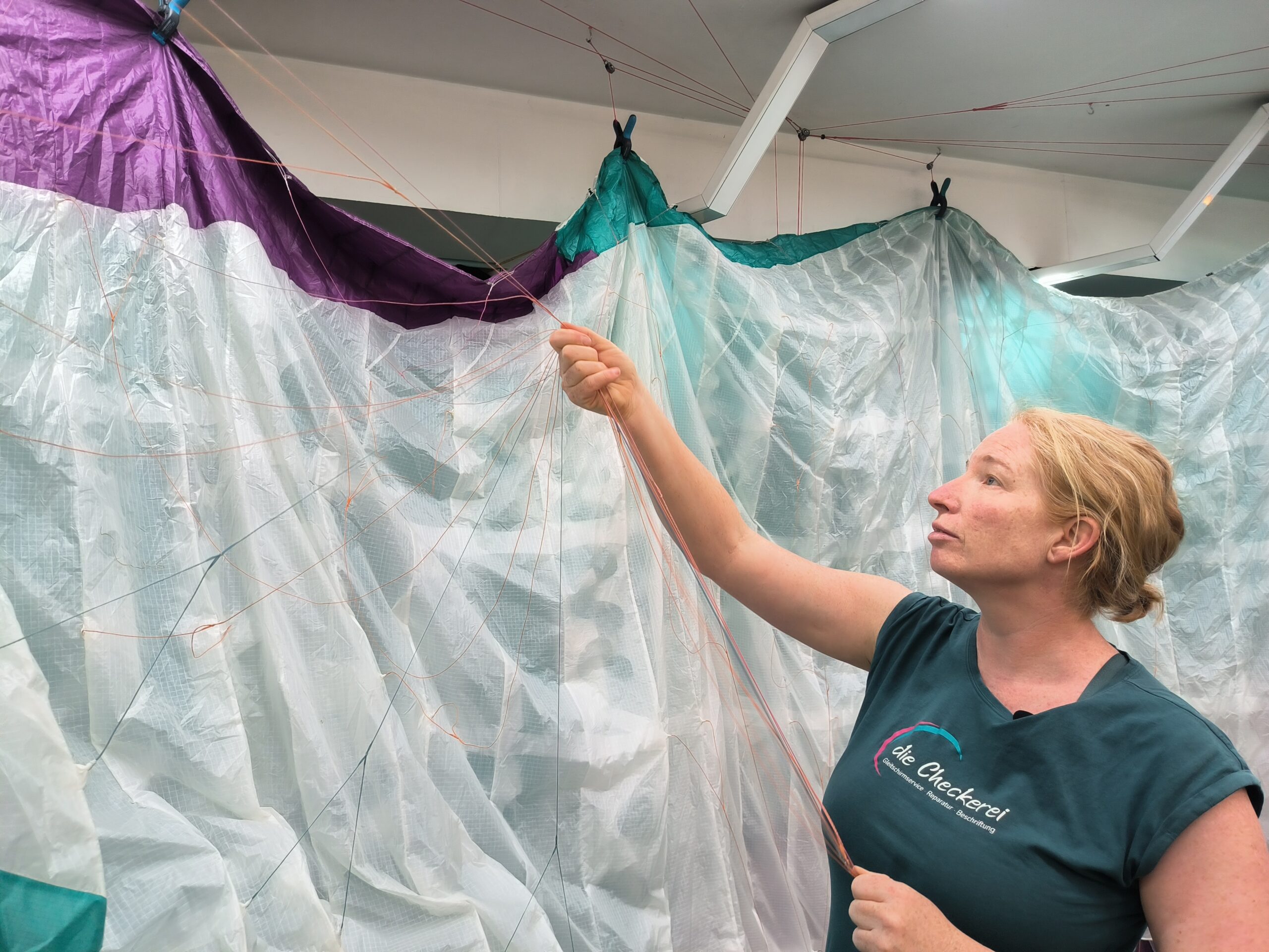 Der Gleitschirm muss nach 2 Jahren oder einer bestimmten Anzahl von Flugstunden zum Check. Welche Schritte hierbei durchzuführen sind, welche Dinge dabei besonders zu beachten sind, Tipps und Tricks, wie man seinen Gleitschirm pfleglich behandelt, habe ich mir von Michaela Michi Brandstätter, Inhaberin des Checkbetriebs „Die Checkerei“, erklären lassen.