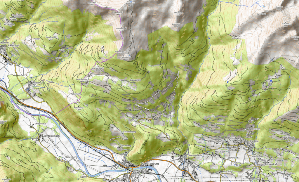 The OpenStreetMap maps show overhead power lines, I use OpenTopoMap for flight planning. In this example, you can see the pilot’s grill in the Drau valley mentioned above. The squares represent the pylons, so the voltage can be estimated: The greater the distance between the masts, the greater the tension.