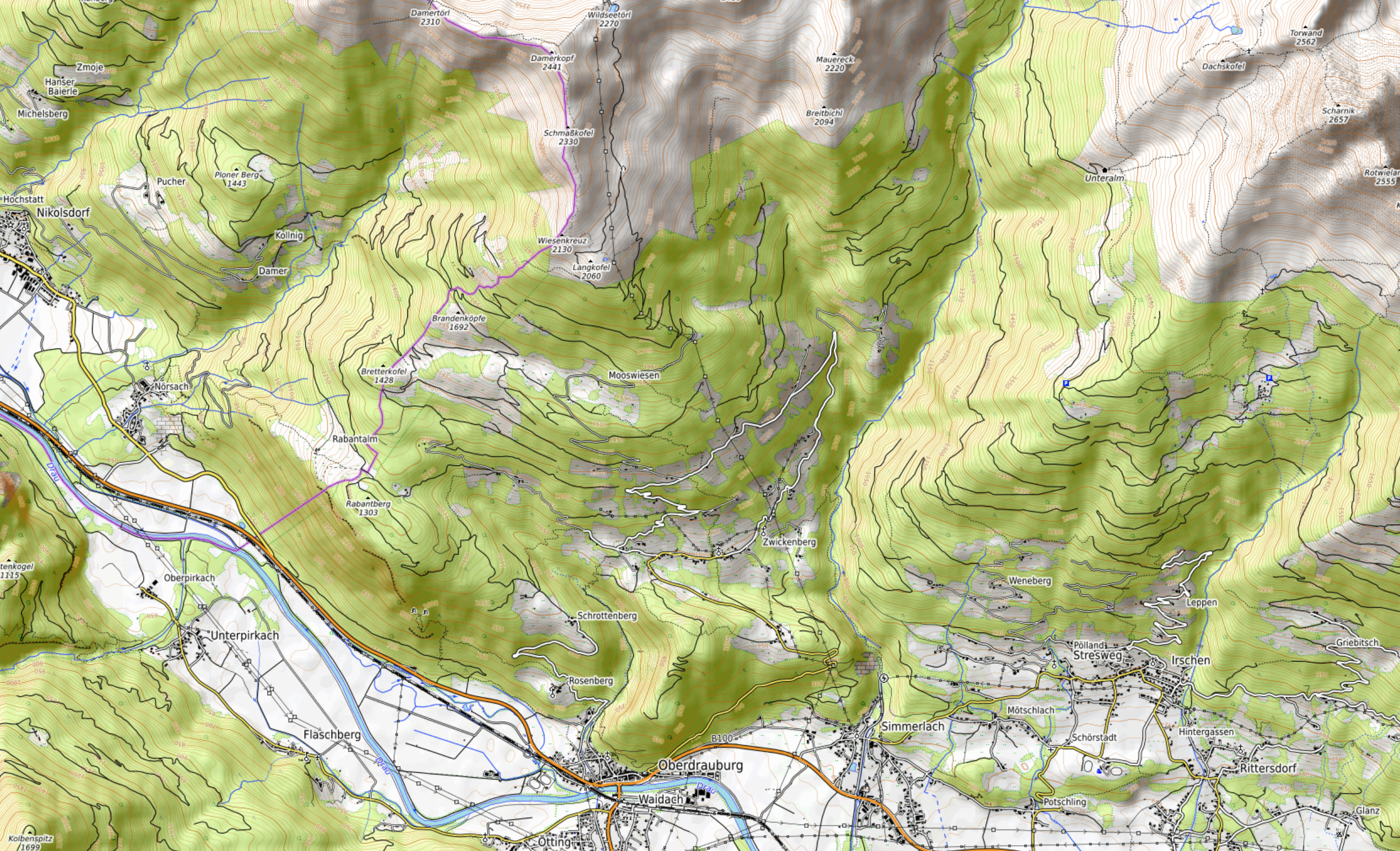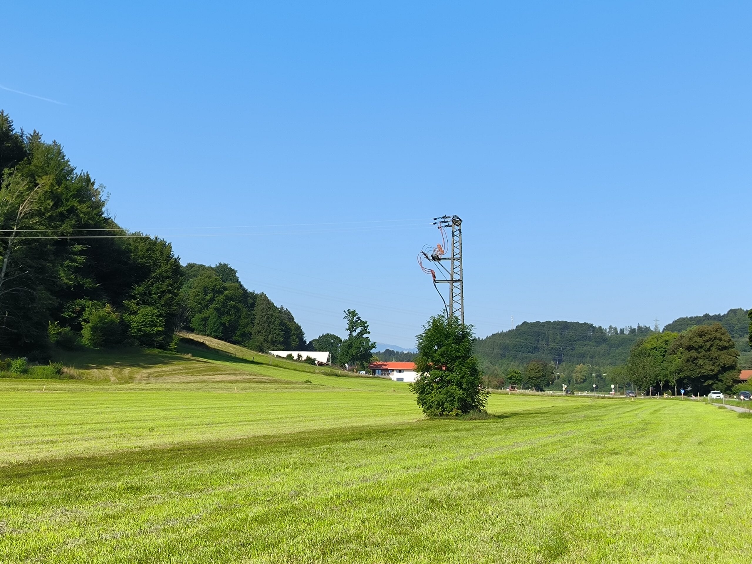 The OpenStreetMap maps show overhead power lines, I use OpenTopoMap for flight planning. In this example, you can see the pilot’s grill in the Drau valley mentioned above. The squares represent the pylons, so the voltage can be estimated: The greater the distance between the masts, the greater the tension.
