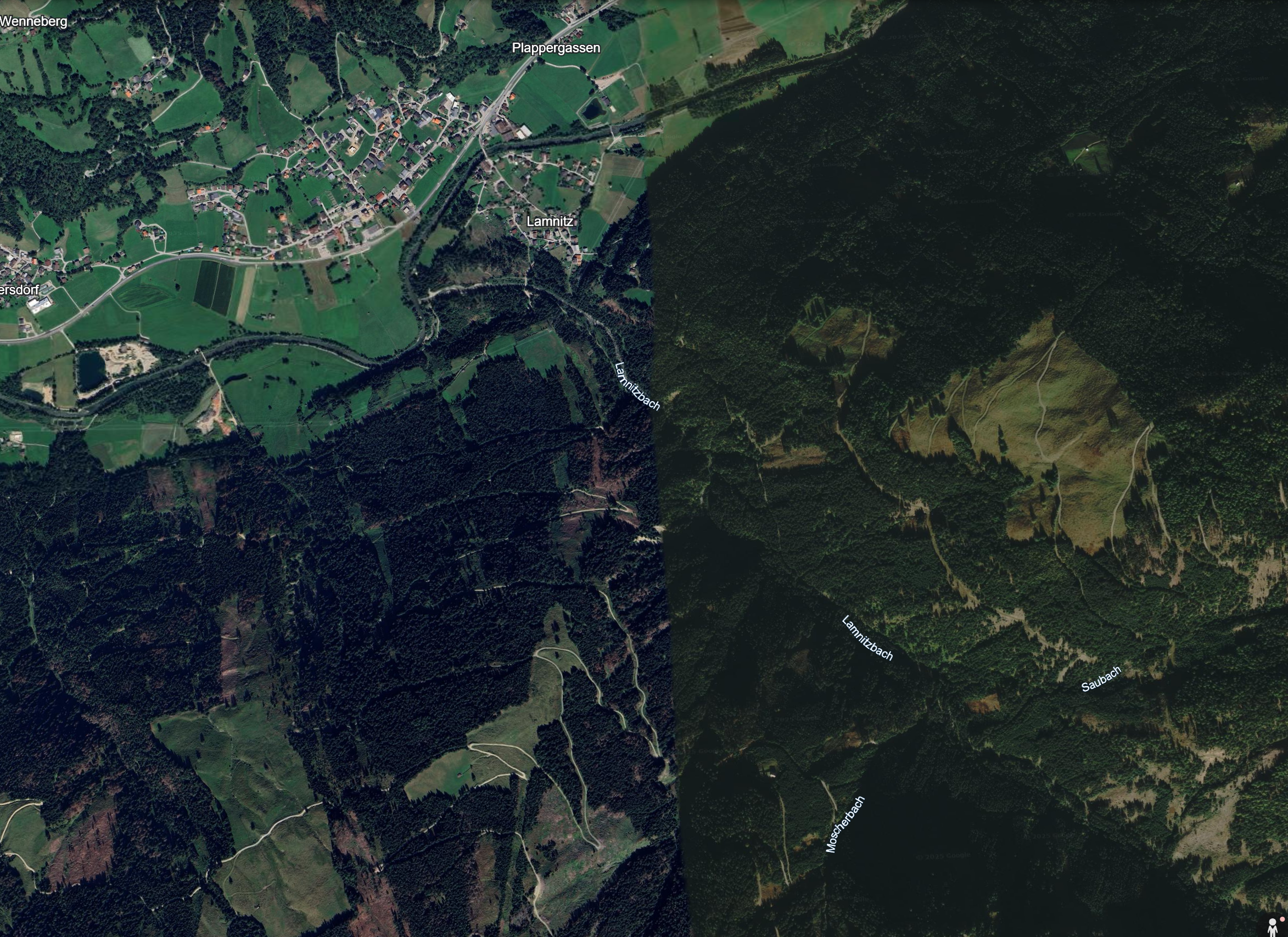 Overhead power lines are difficult to recognise on Google Earth. In the example, the overhead lines in Mölltal are clearly visible, but probably only because they are relatively new and therefore shine silvery in the sun. The branch over the mountains towards Drautal to Pilotengrill can no longer be recognised, but only the forest aisle gives an idea that there could be an overhead line there.