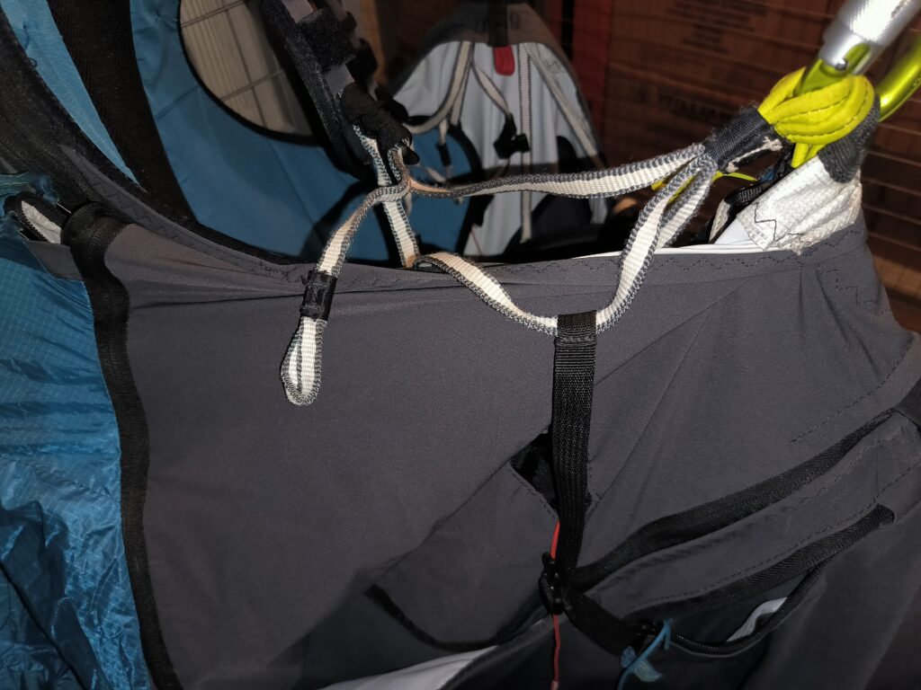 The distance between the carabiners is fixed by the size, in my case 44 cm for the M size. It is therefore not possible to readjust the distance in flight in order to react to different external conditions, e.g. to reduce the distance in strong thermals.