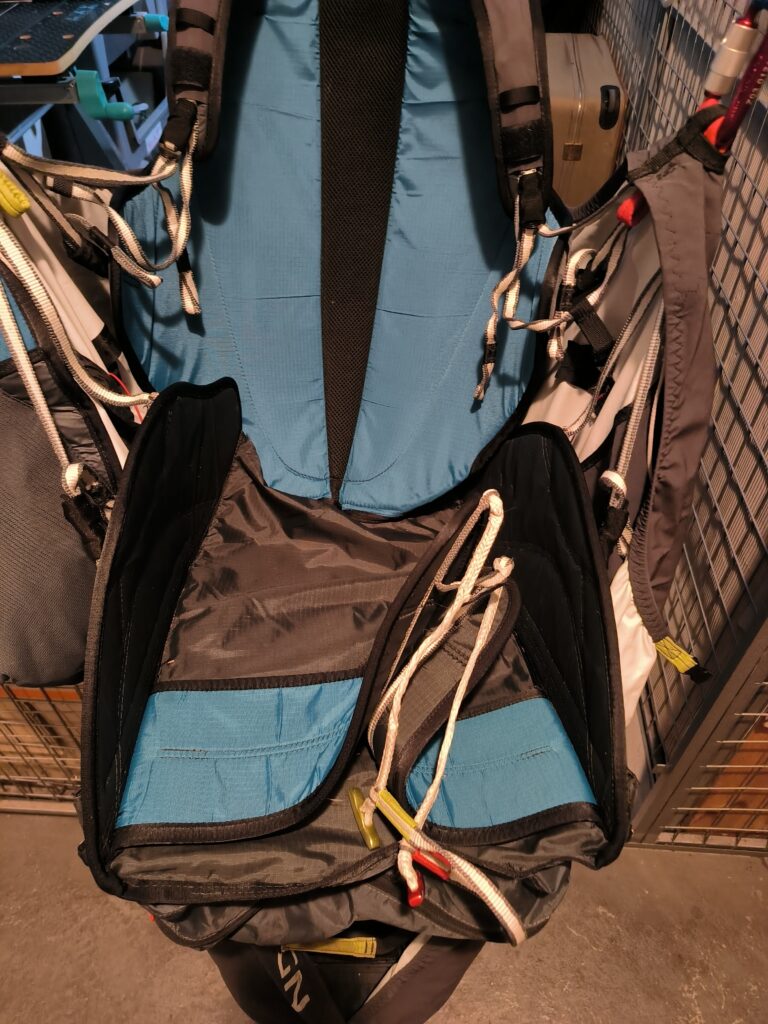 Due to the high suspension, the harness is relatively stable in the air. However, due to the calm winter air, I cannot say how the harness will behave in turbulent thermals. The tail bag should be packed carefully. Objects (buckles etc.) can cause discomfort in the back due to the thin fabric in the back area above the protector. The leg bag closes properly, I did not feel any draughts.
